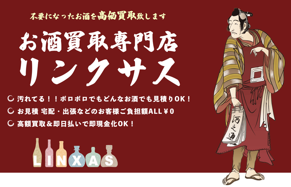 お酒の買取なら専門店リンクサスにお任せください。 ウイスキー、シャンパン、ブランデー、ワイン、日本酒など 不要になったお酒を高価買取いたします。 宅配買取は全国対応、大量の場合は出張買取。送料、出張料、見積もりはすべて無料。 バイヤーの専門知識を持つスタッフが査定いたします。