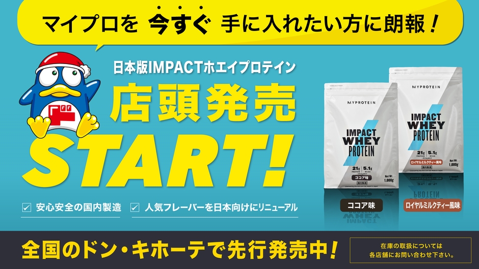 THE HUT GROUPが運営する英国発ヨーロッパNo.1スポーツ栄養ブランド「マイプロテイン」が、2021年11月15日より、日本版Impact ホエイ プロテイン(1kg)の店頭販売を開始いたしました。フレーバーはココア味とロイヤルミルクティー風味の2種類で、全国のドン・キホーテにて先行販売中です。