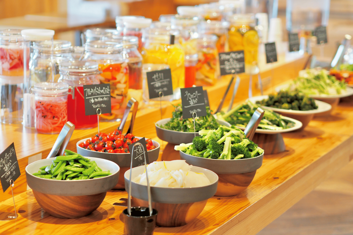 併設のレストラン「Cafe&Meal MUJI」では、旬の野菜をビュッフェ形式で楽しめる「里山のサラダバー」が大人気。2024(令和6)年には屋外に「里山デッキ」が新設され、季節の花々や田園風景を眺めながら、のんびりとテイクアウトメニューを味わうこともできます。