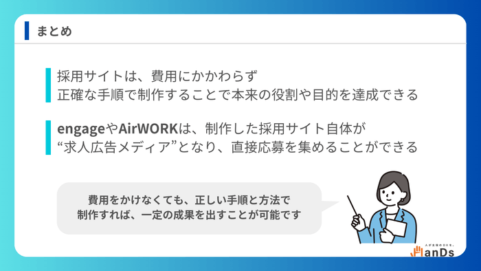 HanDsでは、engageを含む『0円採⽤』のつくり⽅について、期間限定でオンラインの無料サポートを実施しています。まずは現状の採用サイトや求人票を無料診断し、改善方法をアドバイス。従業員10名に満たない企業も成功している、採用のノウハウをお伝えします。