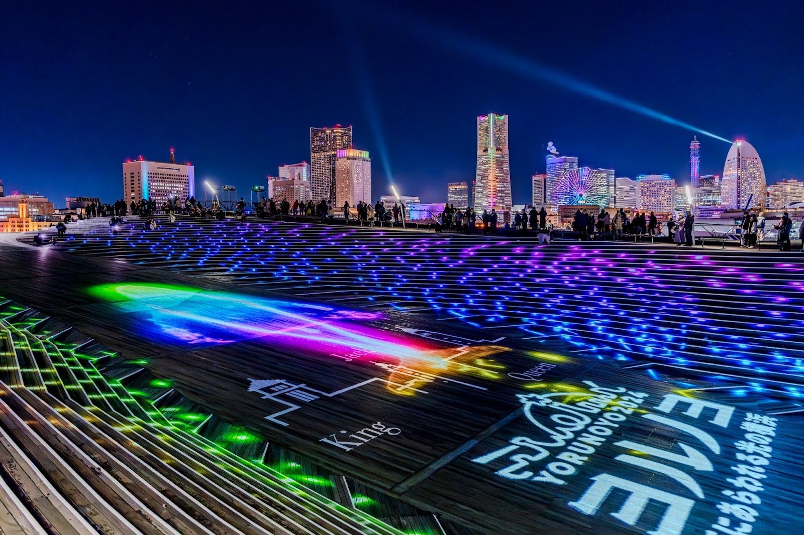 2025年の横浜は、都市全体を使った未来志向のイルミネーションへと進化しました。都市連動型イベント「ヨルノヨ2025」では、みなとみらい〜山下公園の3km超で46施設が光と音楽を同期させ、圧巻のスケールを演出。山下公園には、人の動きに反応する全長250mのインタラクティブアートも登場し、没入型の体験を提供します。