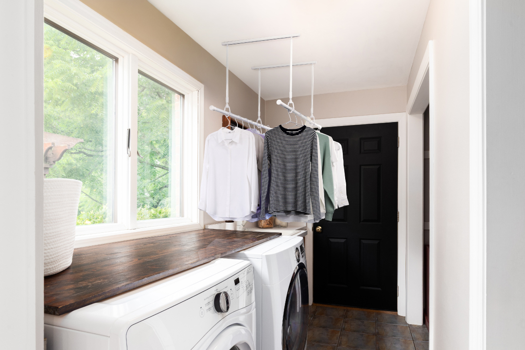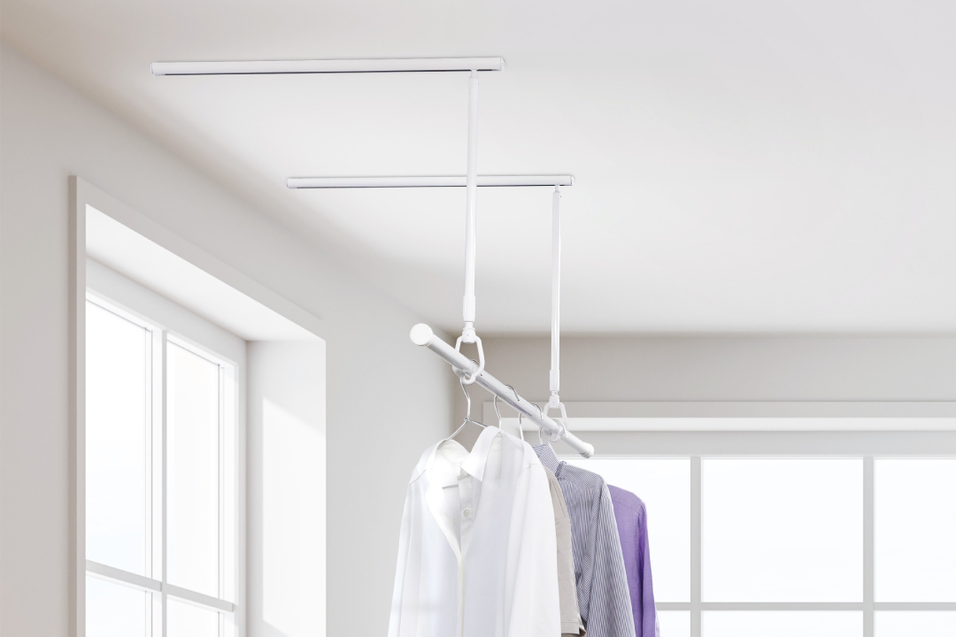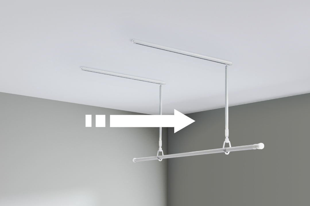 物干し竿を付けたまま壁際へ移動。動線と空間を有効活用する新構造の室内物干し