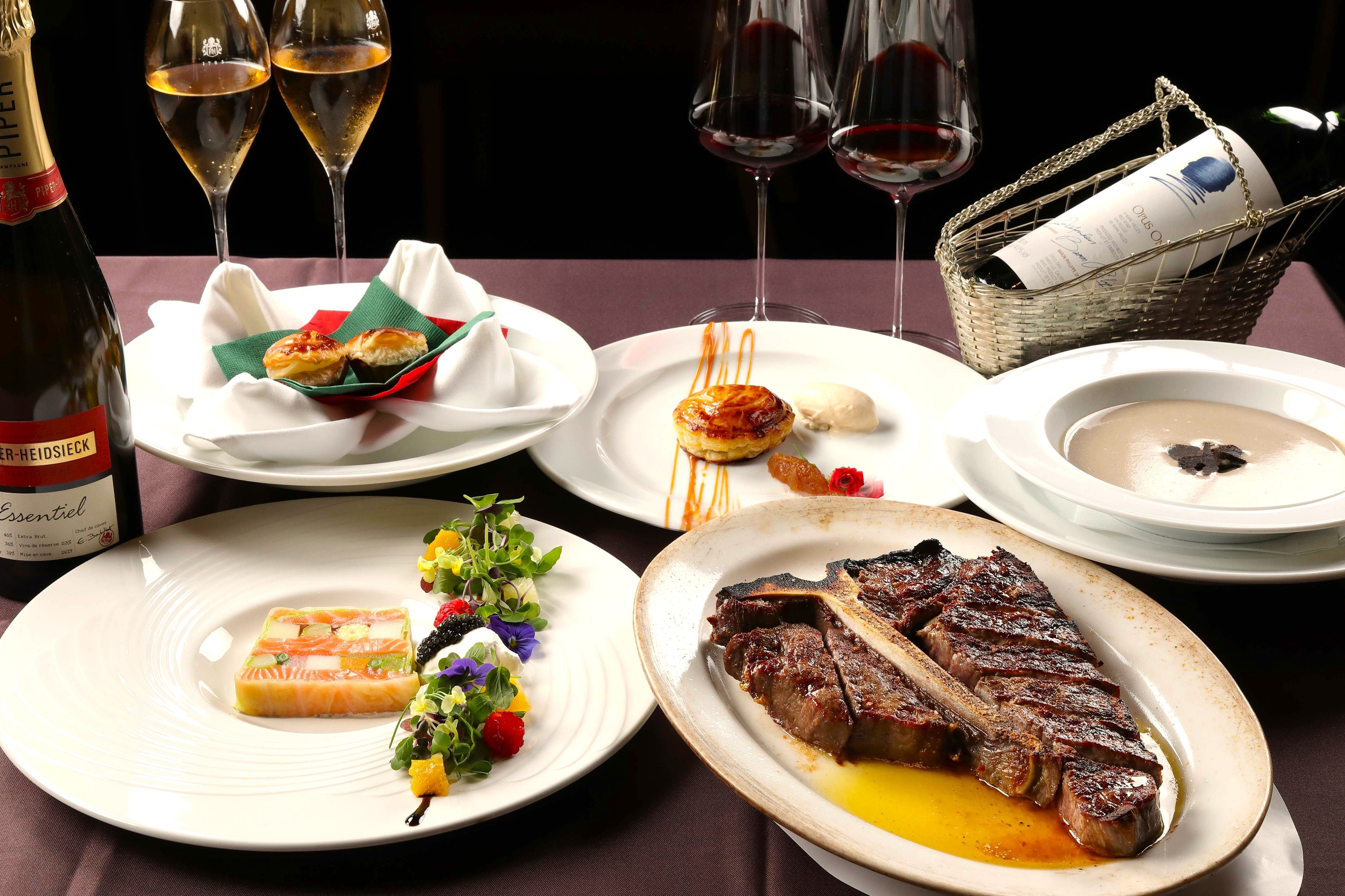 ディナーでは、サーモンと野菜の旨味を閉じ込めたテリーヌにキャビアを添えた前菜、トリュフとポルチーニを贅沢に使用した薫り高い濃厚なスープ、メインはフォアグラバターを添えた最上級プライムビーフのフィレミニョンステーキ、もしくはベンジャミンステーキハウスの看板メニューでもあるUSDAプライム熟成肉のTボーンステーキをお楽しみいただけます。特別な夜にふさわしい至高のディナーコースで、大切なひと時をお過ごしください。