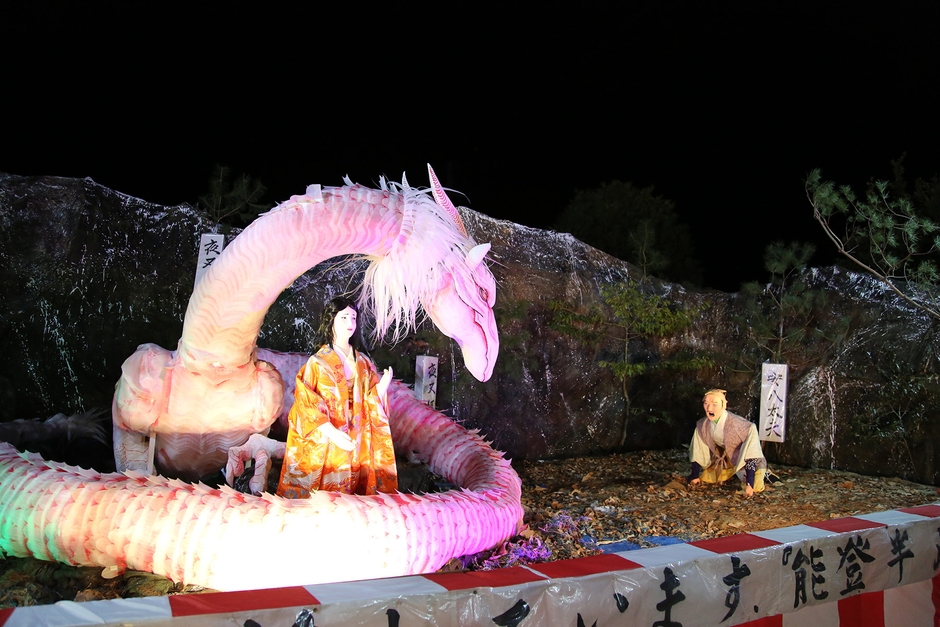 おたや祭の特徴として、独特な「山車」があげられます。「山車」というと「神輿」に近いものを想像される方が多いですが、おたや祭りの山車は時代劇のワンシーンを切り取ったような展示。これは「山車」本来の目的である神様への奉納芸能や、町の繁栄を誇示するエンターテインメントが表現されているものです。素朴な農民美術を伝承する貴重な伝統文化として、昭和38年に長野県選択無形民俗文化財に指定されました。現在は区単位の5場所の保存会によって製作されています。