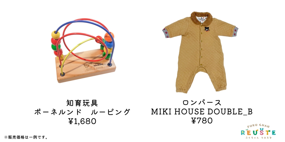 子育て世帯の必需品である抱っこ紐やベビーカー等は、人気ブランドの商品がリユースに見えない品質、リユースならではの価格で手に入り、デザイン性が高いファッションアイテムやこどもの感性を育む知育アイテム等もお求めやすい価格で取り揃えております。