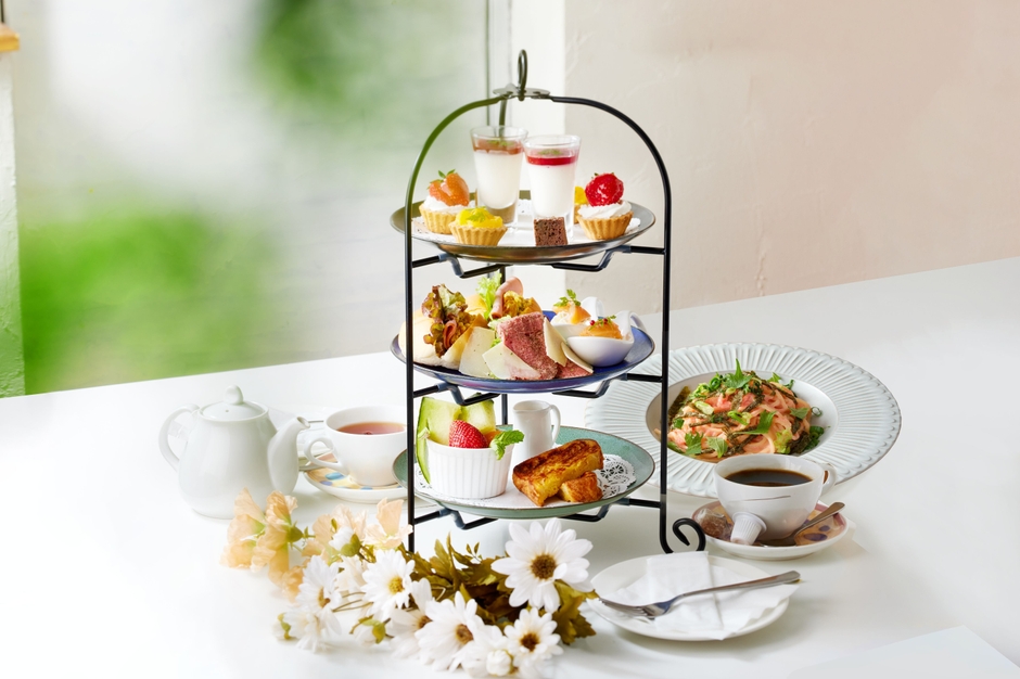 季節限定のアフタヌーンティー「夏を彩るアフタヌーンティー」にはレアチーズと桃のゼリー、マンゴータルト、メロンのシュークリームなど、夏の果実をふんだんに使った爽やかなスイーツが並びます。セイボリーには、オープンサンドやローストビーフ、ふんわりと仕上げたオムレツなどをラインナップ。さらに、プラス500円(税込550円)で“日本にもっと美味しい紅茶を届けたい”というコンセプトの〈amsu tea(アムシュティー)〉の紅茶を含むカフェメニューがお替わり自由で楽しめます。※時期により内容が異なる場合がございます