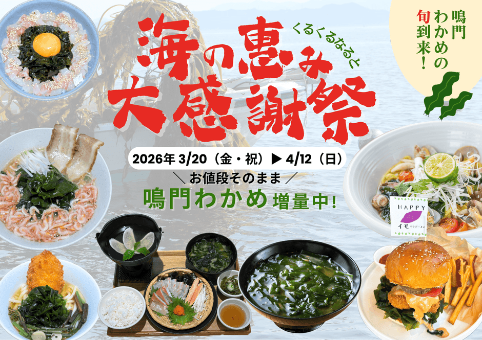 2026年3月20日(金・祝)~4月12日(日)の計24日間で「海の恵み大感謝祭」を開催いたします。道の駅くるくる なると内の大渦食堂では「鳴門わかめ汁」、カフェでは「鳴門わかめとアサリのボンゴレ」や「なると鯛バーガー」をお値段そのままで、わかめを通常の30%増量でご用意します。期間限定メニューとして、大渦食堂では「鳴門わかめと鯛ぶりのうず潮しゃぶしゃぶ」や「鳴門わかめと阿波尾鶏コロッケの春うどん」など5種のメニューが登場!お土産コーナーでは、新商品の「ご飯がすすむ 鳴門わかめのザク飯だれ」が登場の他、新物の生わかめ、糸わかめ、鳴門わかめの加工品など幅広く取り揃えております。