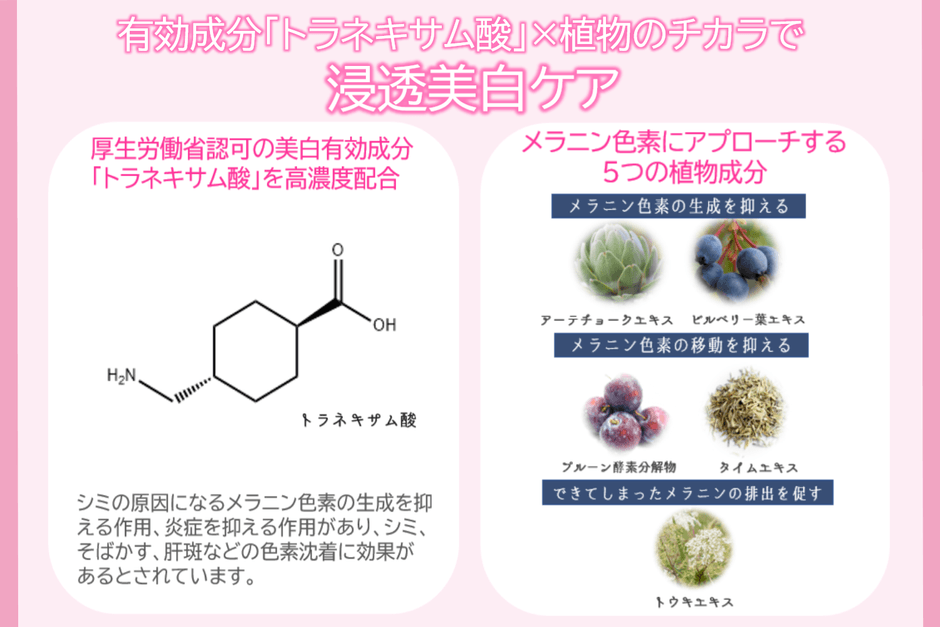 美白成分には有効成分「トラネキサム酸」を採用。また、有効成分以外にもメラニン色素の生成を抑える、「アーティチョークエキス」、「ビルベリー葉エキス」、メラニン色素の移動を抑える「プルーン酵素分解物」「タイムエキス」、できてしまったメラニンの排出を促す「トウキエキス」を配合し、黒ずみにしっかりアプローチします。