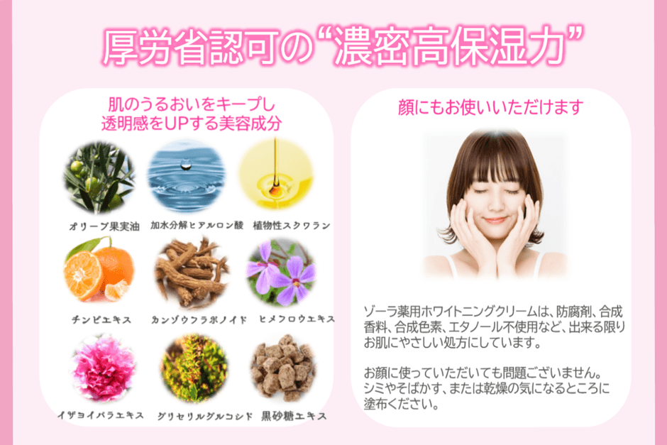 ZOVLA薬用ホワイトニングクリームは、小じわの効能評価試験済で厚生労働省から「乾燥による小じわを目立たなくする」という標ぼうの認可が下りている程、保湿力の高い濃密クリームです。