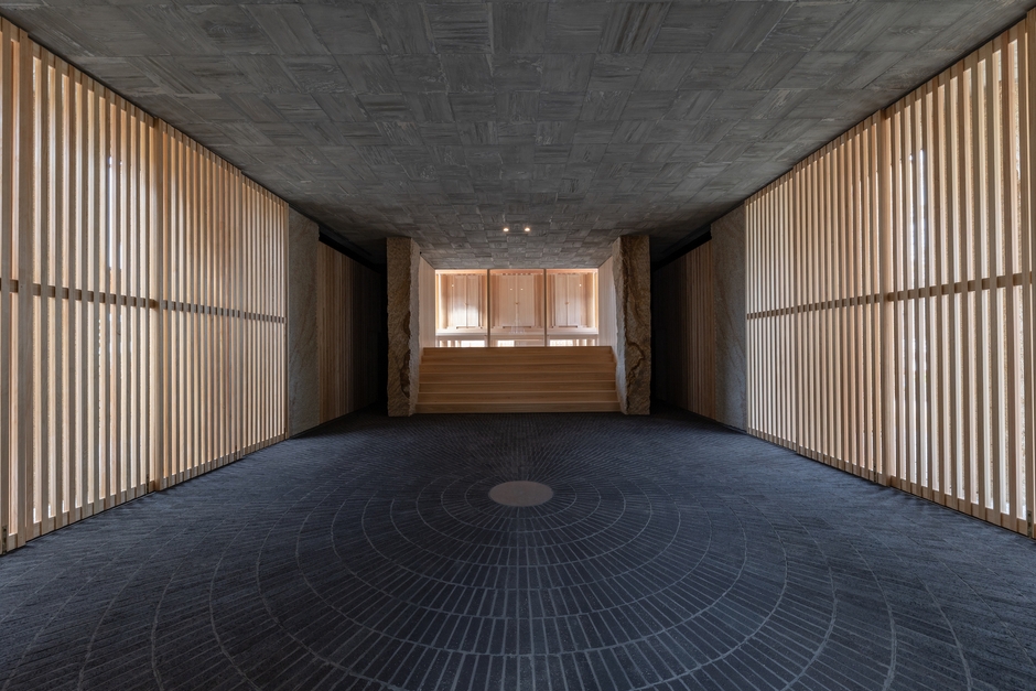 最大高さ10メートル、重さ15トンの石柱を10本配しています。外観でも目を惹きますが、中に入るとさらに存在感を感じることでしょう。内装の壁面は黒しっくい、床は黒レンガとなり、かなり落ち着いた景観となっています。