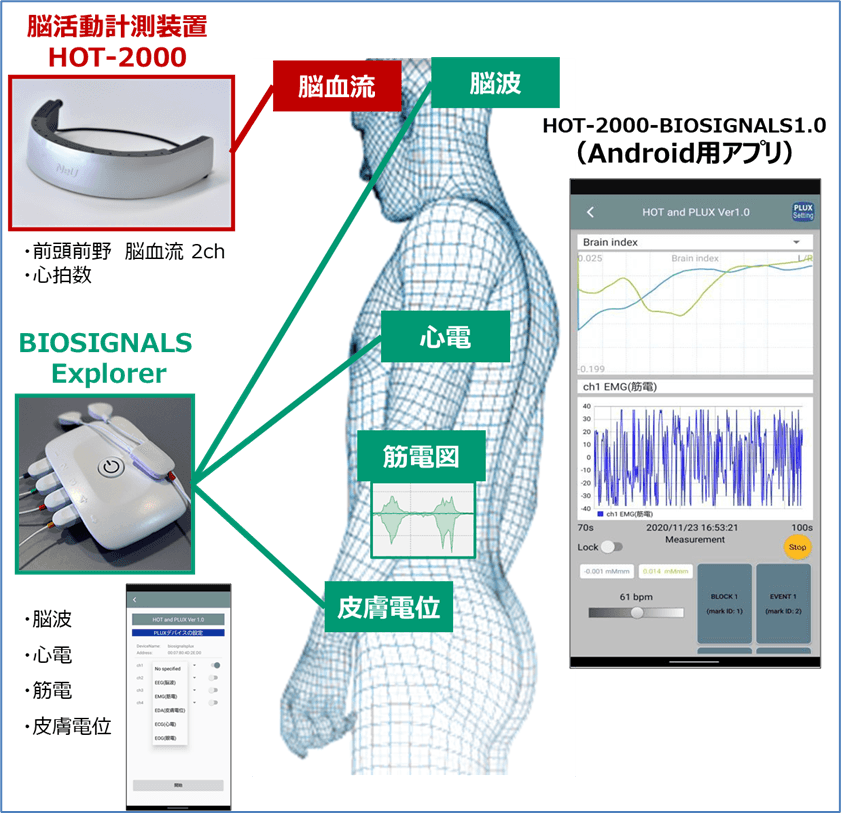 国立大学法人東北大学と株式会社日立ハイテクのジョイントベンチャーである株式会社NeU(本社:東京都千代田区、代表取締役:長谷川 清、以下、NeU)は、脳活動に加え、さまざまな生体信号をマルチモダルにて同時に計測するシステム「HOT-2000-BIOSIGNALS」を発売いたしました。前額部の血流量変化をリアルタイムに計測できる「HOT-2000」と多種の生体信号(筋電、皮膚電位、心電他)を1つのアプリで取得することが可能です。ワイヤレスな環境にて計測が可能であり、より日常的環境での研究実験に適しています。