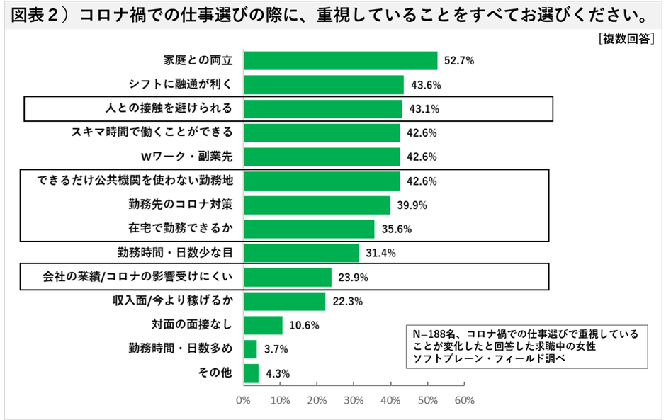 コロナ禍での仕事選びの際に重視していることを選択肢で尋ねると、「家庭との両立(52.7%)」が半数以上を占め最多となり、「シフトに融通が利く(43.6%)」が続きました。「子供が学校にいる時間帯に働きたい(40代パート)」、「家事と両立できる仕事(50代自営業)」といった、新型コロナ感染拡大前と同様に、家庭や育児を優先させて無理なく自分のペースで働けることが最重要視されているようですが、「今後休校の可能性もあり得るので融通の利く職場(40代個人事業主・フリーランス)」といった、収束の見通しが立たない中で仕事のやりやすさを挙げるコメントもありました。