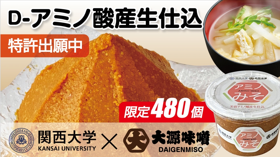 関西大学化学生命工学部 老川 典夫教授と創業198年の大阪の老舗味噌屋、大源味噌との共同研究によって開発した新規製造技術(特許出願中[特願2021-100845 D-アミノ酸を含有する味噌の製造方法])に基づき、これまで製品例のないD-アミノ酸を醸造中に産生させた特別醸造味噌『アミノみそ』が完成しました。