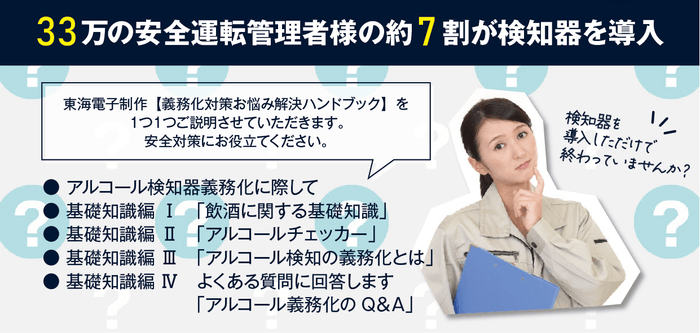 これらの疑問に、東海電子が制作した【義務化対策お悩み解決ハンドブック】を元に、1つ1つご説明させていただきます。ぜひ、無料ウェビナーに参加いただき、安全対策にお役立てください。