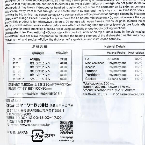 食洗機・フタ、中フタを外して電子レンジ使用可◎【容量:600ml(上段230ml、下段370ml)】サイズ:9cm×16.9cm×10cm 素材:フタ:AS樹脂/耐熱温度100度、本体、中フタ:ポリプロピレン/耐熱温度140度、止具:仕切:ポリプロピレン/耐熱温度140度、パッキン:シリコーンゴム/耐熱温度140度