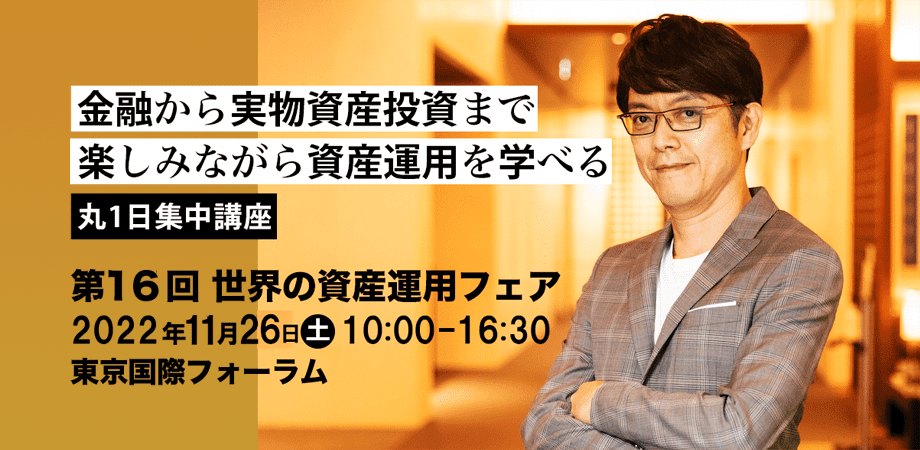 株式会社資産デザイン研究所(所在地:東京都中央区銀座5-10-10、代表:内藤 忍)は、金融資産から実物資産まで投資対象を短時間で体系的に学べる半年に一度の丸1日集中講座「第16回 世界の資産運用フェア」を、2022年11月26日土曜日に東京国際フォーラムホールD7にて開催いたします。
