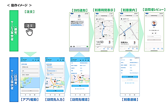 『ドコビジタ』は、これらの配送・訪問事業者と顧客の不安や不満を解消するため、ドライバーが次に訪問する訪問先情報を入力することで、顧客にドライバーの位置情報をSMSにて発信、顧客はアプリをインストールすることなく、ドライバーの現在地と到着予定時刻を把握することができます。配送・訪問事業者には「よりスムーズな訪問」を、顧客には「より安心した訪問」を提供することで、配送・訪問事業者の業務効率と顧客満足度の向上を支援します。