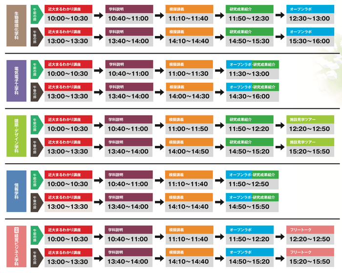 ●文系1学科・理系4学科がそれぞれ学科説明、模擬講義、オープンラボなどを実施