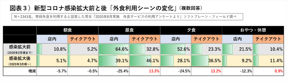 今までの調査結果から、主に利用シーンにおいては、「昼食・夕食」の時間帯の、店内飲食からテイクアウトにシフトしつつあることが傾向として表れています。