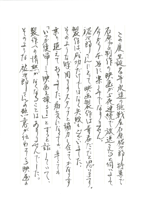 裕次郎さんにとって映画製作は青春だったと思います。病気になっても、辛くても、「いつか復帰して映画を撮る!」とずっと話していて、製作への情熱がなくなることはありませんでした。