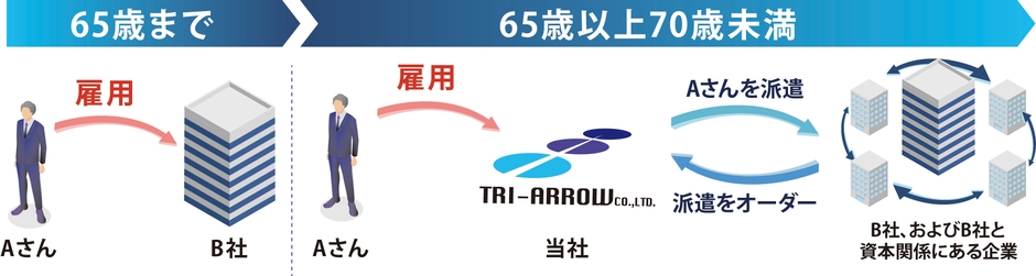 ご依頼をいただいた事業者にて定年を迎える65歳以上70歳未満の高年齢者の方を当社にて雇用し、当該事業者とそのグループ企業、および資本関係にある企業(※)へ派遣します。その際、ご依頼をいただいた事業者と当社との間で、改正高年齢者雇用安定法が定める『継続雇用制度の対象となる高年齢者を定年後に特殊関係事業主が引き続いて雇用することを約する契約』を締結することにより、当該事業者は国の定める「努力義務」を果たしたとみなされます。