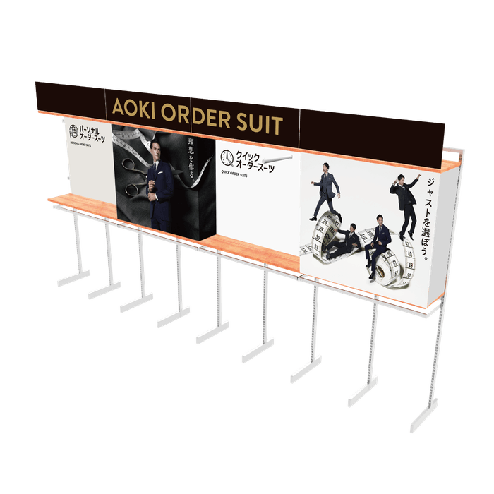 株式会社AOKI様のオーダースーツ売り場装飾に採用された実績をもとに、店舗ごとにサイズのカスタマイズが可能な仕様にてご提供。店舗のスタッフ様が簡単に設置できるため、全国規模の展開にも最適です。今後も、店舗プロモーションにおける新しい価値を提供し続けてまいります。