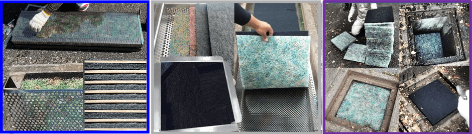 こうした問題を解決するためには、雨水以外の流入を極端に制限する必要があります。例えば、グレーチングの極細分別集水化を行うことで、維持管理サイクルを、グレーチング下の排水路内を確認しにくい状況判断から、常に目視できるグレーチング上の状況判断にできるため、雨が止んだ後の日を起点に、日常的な軽作業で管理が可能になり、コスト軽減と環境負荷の軽減が可能になります。