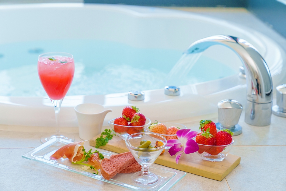 お部屋のジャグジーでゆったりと身体を癒しながら、みずみずしいいちごを頬張る贅沢なひととき。個性が光る九州ブランド3種食べ比べや、オリジナルカクテルなどもご用意いたします。