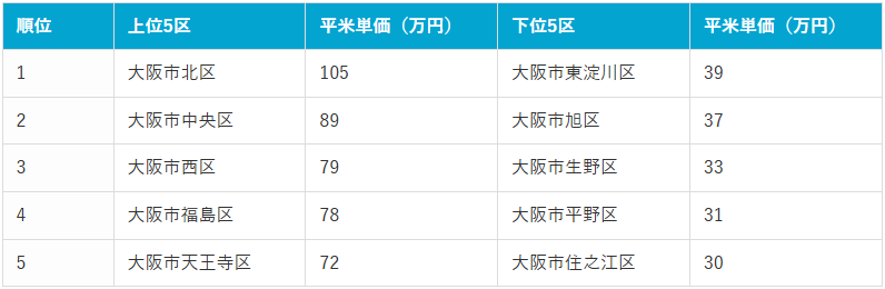 大阪市内の平均売買価格は、上昇率1位の北区で7,000万円台、24位の平野区で2,000万円台と大きな開きがあります。