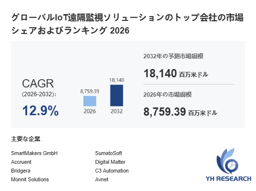YHResearch調査チームの最新レポート「グローバルIoT遠隔監視ソリューションのトップ会社の市場シェアおよびランキング 2026」によると、世界のIoT遠隔監視ソリューション市場は2025年に7760百万米ドル規模に達すると予測され、2026年には8759.39百万米ドルに拡大する見込みです。2032年までに18140百万ドルに達すると予測されており、2026年から2032年までの期間における年平均成長率(CAGR)は12.9%と予想されています。