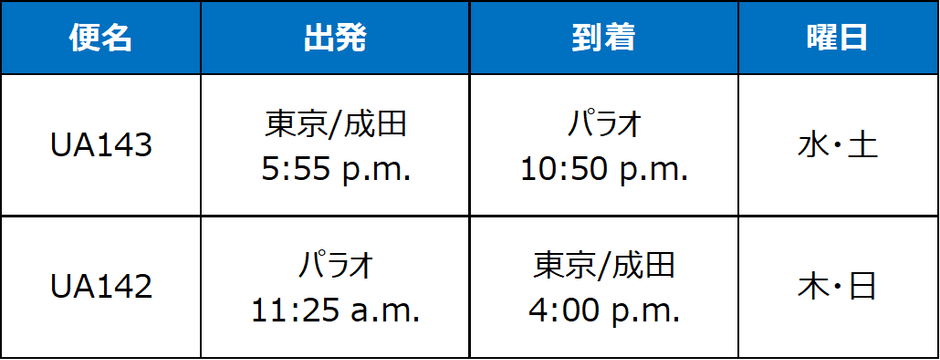 他社が運航していた東京/成田-パラオ定期直行便が2018年に取りやめとなって以来、日本とパラオを結ぶ定期直行便はなく、グアムで乗り継ぎした場合のフライト時間は最短で8時間でした。今回、ユナイテッド航空が8年ぶりとなる定期便での直行便を就航。フライトは約5時間に短縮されました。今後は週2便運航する予定となっています。