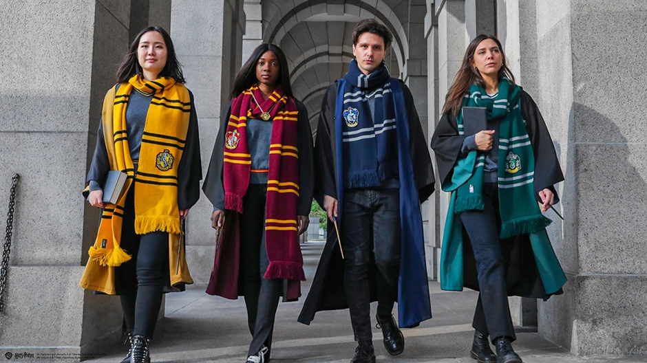 ハリー・ポッターに登場する4つの寮それぞれのイメージカラーをベースにし、刺繍で表現した紋章を付けたコレクタブルなデラックススカーフ。映画に登場するキャラクターが身に着けていたスカーフを、忠実に再現しています。