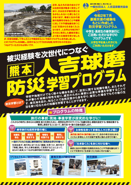 令和2年7月豪雨により甚大な被害を受けた熊本県人吉市は、現在も復旧・復興に向け歩みを進めています。今回、豪雨災害の教訓の発信だけでなく、地域再生へ向けての取組みなどを幅広い世代に伝えるため、「人吉球磨防災学習プログラム」を開発しました。