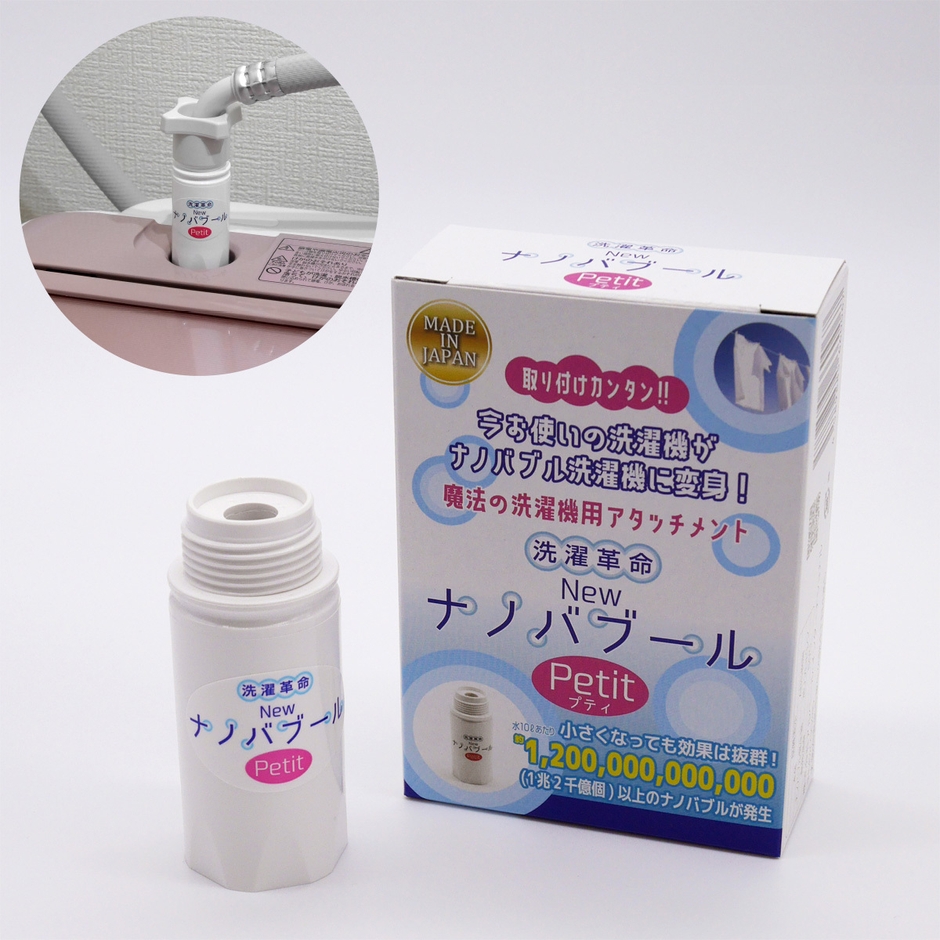 洗濯革命 New ナノバブール プチ(Petit)を使えば、今お使いの洗濯機がナノバブル洗濯機に変身!ナノバブル洗浄で洗浄力UPを実感!誰でも簡単に取り付け可能。