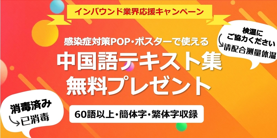 期間限定 宿泊・飲食・小売・観光業界応援キャンペーン! 「感染症対策POP・ポスターで使える 中国語テキスト集(簡体字・繁体字/70語以上収録)」を無料プレゼント ~インバウンド再開に向けてがんばる事業者様を応援~