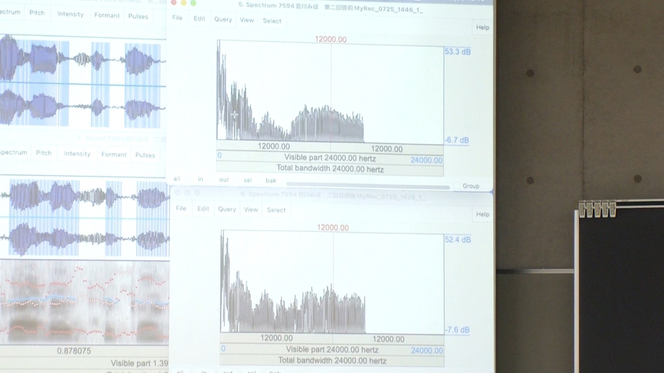 安藤歯科医師は、2007年声の分析の専門家である大川茂樹教授(千葉工業大学副学長、日本音響学会の理事)とともに「歯と音声の研究会」を立ち上げ、それ以降15年以上180人分の音声データの研究をおこない、日本音響学会でも9回の発表を重ねてきました。歯と音声(滑舌)の関連を研究している論文は世界でもほとんどが入れ歯や、歯科矯正のもので、歯並びに外観上問題が無い方(プロの方)でも、わずか0・4mm歯の形を変えるだけで、滑舌を改善するメソッドは、今までの論文でも例がありません。講演を依頼したのは、千葉工業大学副学長で、日本音響学会の理事でもある大川茂樹教授。##image##https://www.atpress.ne.jp/releases/401318/img_401318_3.jpg##大川教授 フォルマント解説