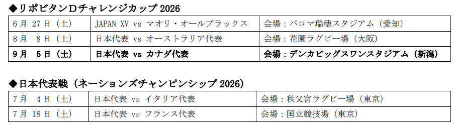 大正製薬株式会社[本社:東京都豊島区 社長:上原 茂](以下、当社)は、公益財団法人日本ラグビーフットボール協会が主催するラグビー日本代表vsカナダ代表戦について、冠スポンサーとして追加協賛し、「リポビタンDチャレンジカップ2026」として開催することが決定いたしました。すでに決定しているリポビタンDチャレンジカップ、ネーションズチャンピオンシップと合わせ、5試合のラグビー日本代表戦に協賛します。