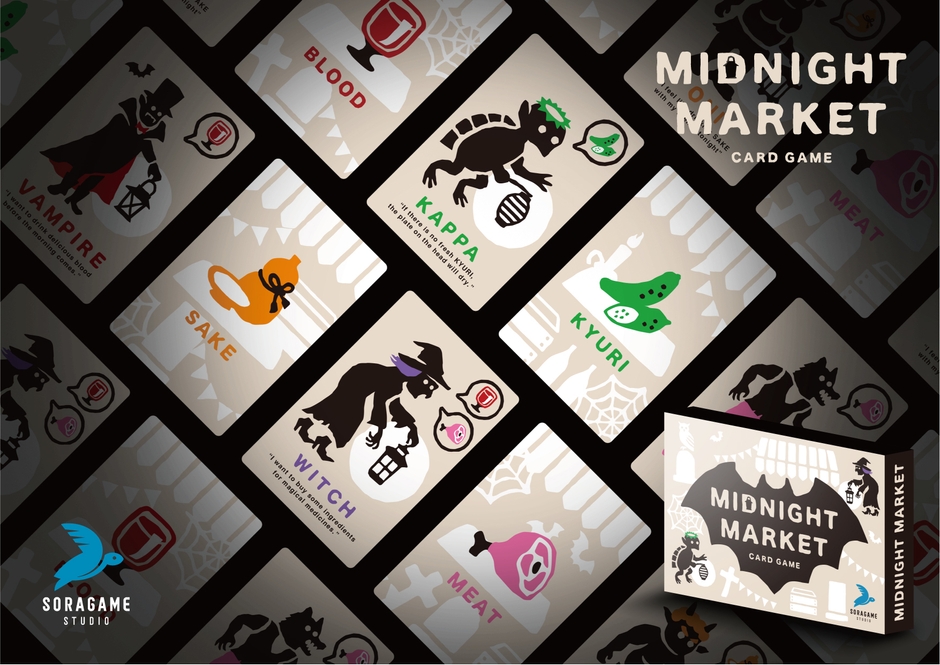 独立系ボードゲームメーカーのソラガメスタジオ(所在地:埼玉県朝霞市、代表:西原 将矢、URL: https://soragamestudio.com/ )は、シンプルながら奥深いゲームシステムと独特な世界観に浸れるアートワークが魅力のカードゲーム「ミッドナイトマーケット」の資金調達を、クラウドファンディングサイト「CAMPFIRE」にて2022年9月19日(祝・月)まで実施しています。開始9日目で目標額100%を達成し、さらなる目標に向け資金調達を継続中です。販売開始はゲームマーケット2022秋を予定しています。