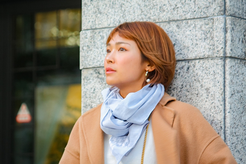 手ぬぐい生地は定番ニットマフラーの1/10程の薄さで、使わないときは畳むことで小さなバッグにもなんなく入ります。電車やバスでの通勤時など、置き場所に困って外せない悩みから解放されます。とても薄い布で防風素材ではないので、ニットやウールマフラーほどの温感機能は無いとしつつも、手軽かつコンパクトさから男女問わず30~40代の働く世代に大きな反響を集めています。