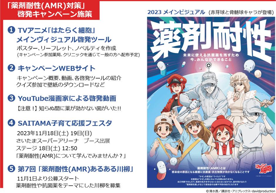 姫路市では、2016年の「薬剤耐性(AMR)アクションプラン」に基づき、さまざまな啓発の取り組みを行っているAMR臨床リファレンスセンターと協力し、11月の「薬剤耐性(AMR)対策推進月間」の啓発キャンペーンの一環として、TVアニメ「はたらく細胞」のポスター展示と啓発ツールの配布、毎年実施されている「薬剤耐性(AMR)あるある川柳」の募集コーナーの展示を行います。