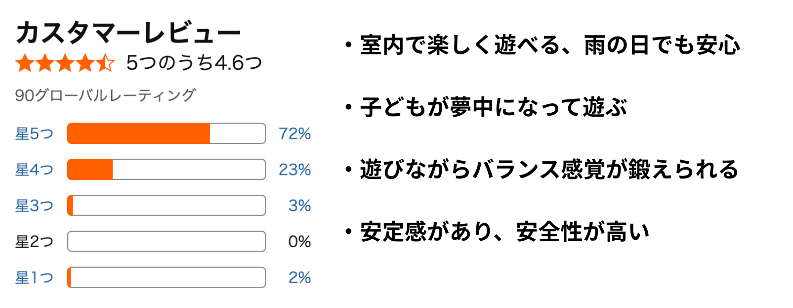 室内遊具市場では1万円を超える商品が多い中、バランスストーンはより手に取りやすい価格で提供しています。高品質でありながらリーズナブルな価格設定が、幅広いご家庭での導入を後押ししました。
