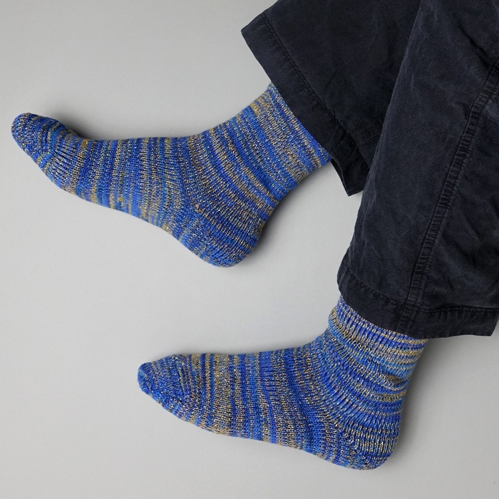 自転車を漕ぐ力で靴下を編む「チャリックス」(https://www.charicks-online.jp/)にも使われている、希少なヴィンテージの靴下編機を使用し、「瑠璃坏」から着想を得た色の糸を束ねて編みあげています。同じ色の糸を使いながらも、一足一足違う色合い・模様の妙を、ぜひお楽しみください。