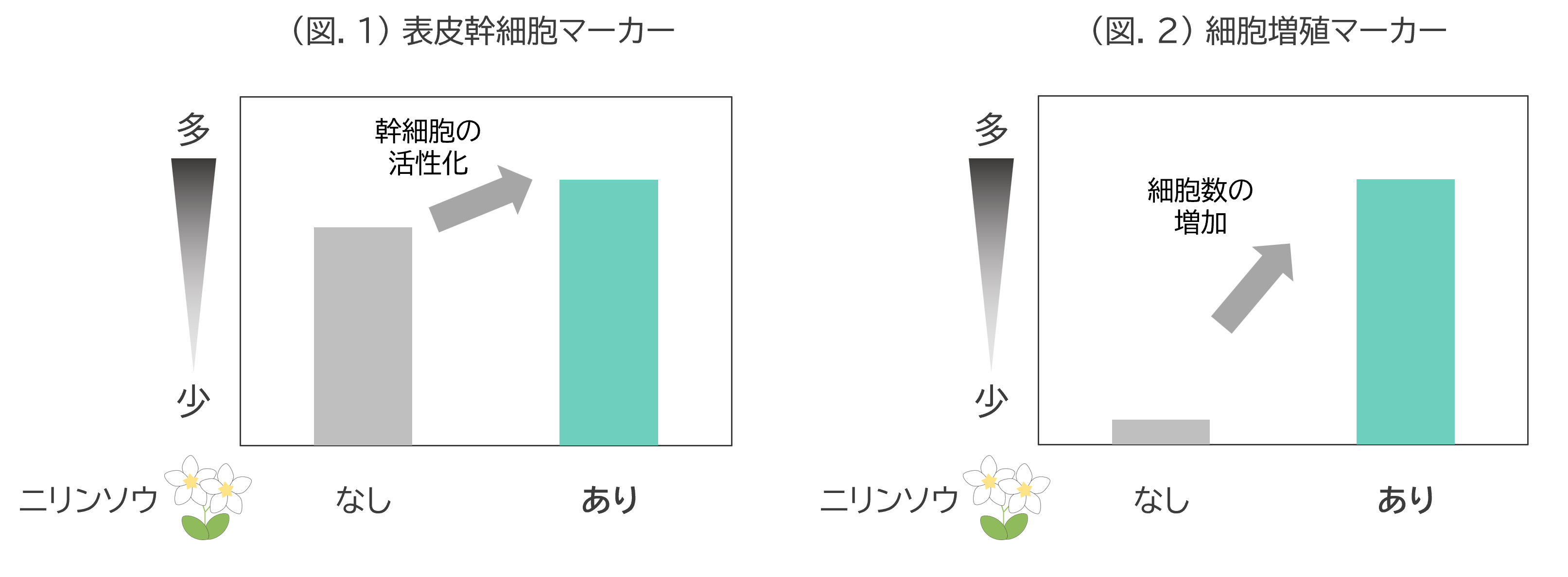 表皮の奥深くで生まれる新しい細胞に各植物エキスを添加したところ、「ニリンソウ」エキスにより表皮幹細胞マーカーが増加したことから、表皮幹細胞の活性化が確認されました(図.1)。さらに、細胞増殖マーカーの増加も認められ、新たな細胞が生み出されていることが示されました(図.2)。これらのことから、「ニリンソウ」は表皮幹細胞を活性化させ、肌の再生力を高めることで、ターンオーバーを改善することが期待できます。