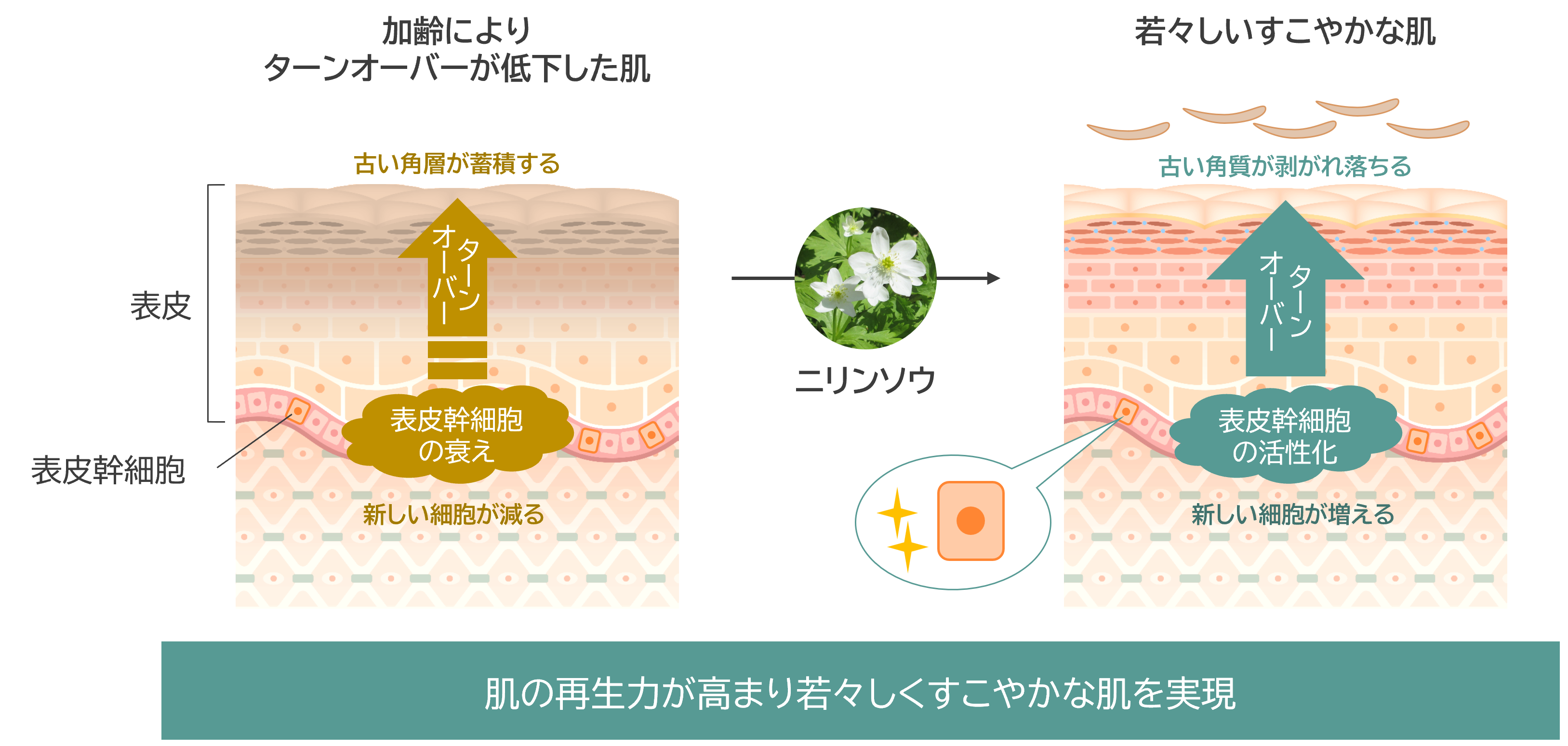「ニリンソウ」が、新しい肌細胞をつくり続ける表皮幹細胞を活性化させ、肌の再生力を高めることで、若々しくすこやかな状態に導く効果が期待できます。この研究成果は今後の基礎化粧品の開発に応用する予定です。