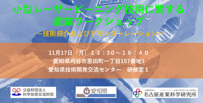 公益財団法人名古屋産業科学研究所は、愛知県が推進する「知の拠点あいち重点研究プロジェクトⅤ期(2025–2028年度)」の国際枠に採択された課題「3D構造物の自動レーザーピーニング技術の開発と応用展開」に関する成果公開イベントとして、11月に「産業ワークショップ」および「国際シンポジウム」を共催します。