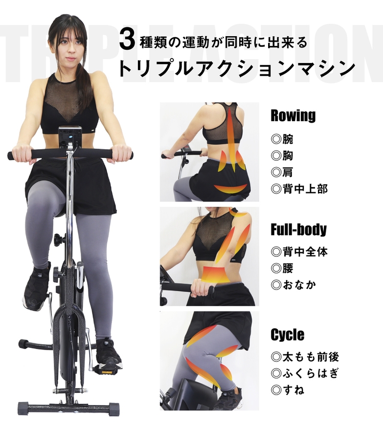 ・トリプルアクション運動(サイクル、ローイング、フルボディ)で腕、背中、足など約10箇所に効果的な運動が行えます。