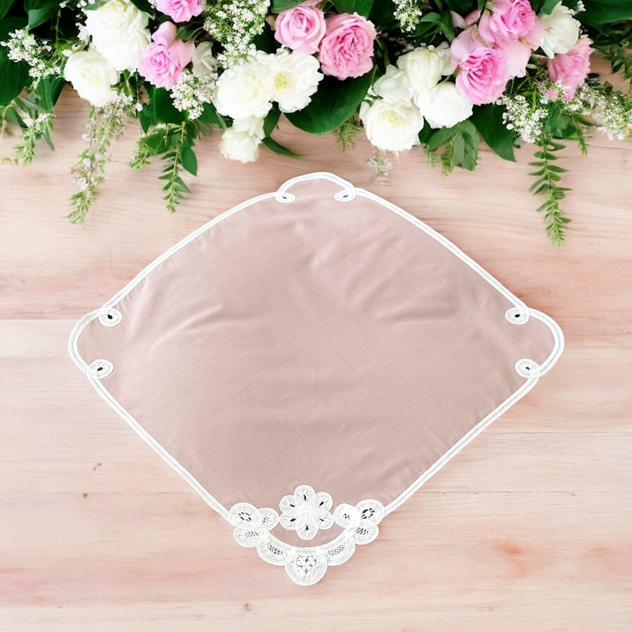 バテンレースとは、明治時代に日本に伝わったレース製品です。糸を幅1センチほどのテープ状に編んだ「ブレード」と呼ばれる縁飾りで図柄の輪郭を描き、その内側を様々なかがり模様を施して作られます。すべて手作業による職人の技術が美しいレースを生み出しています。