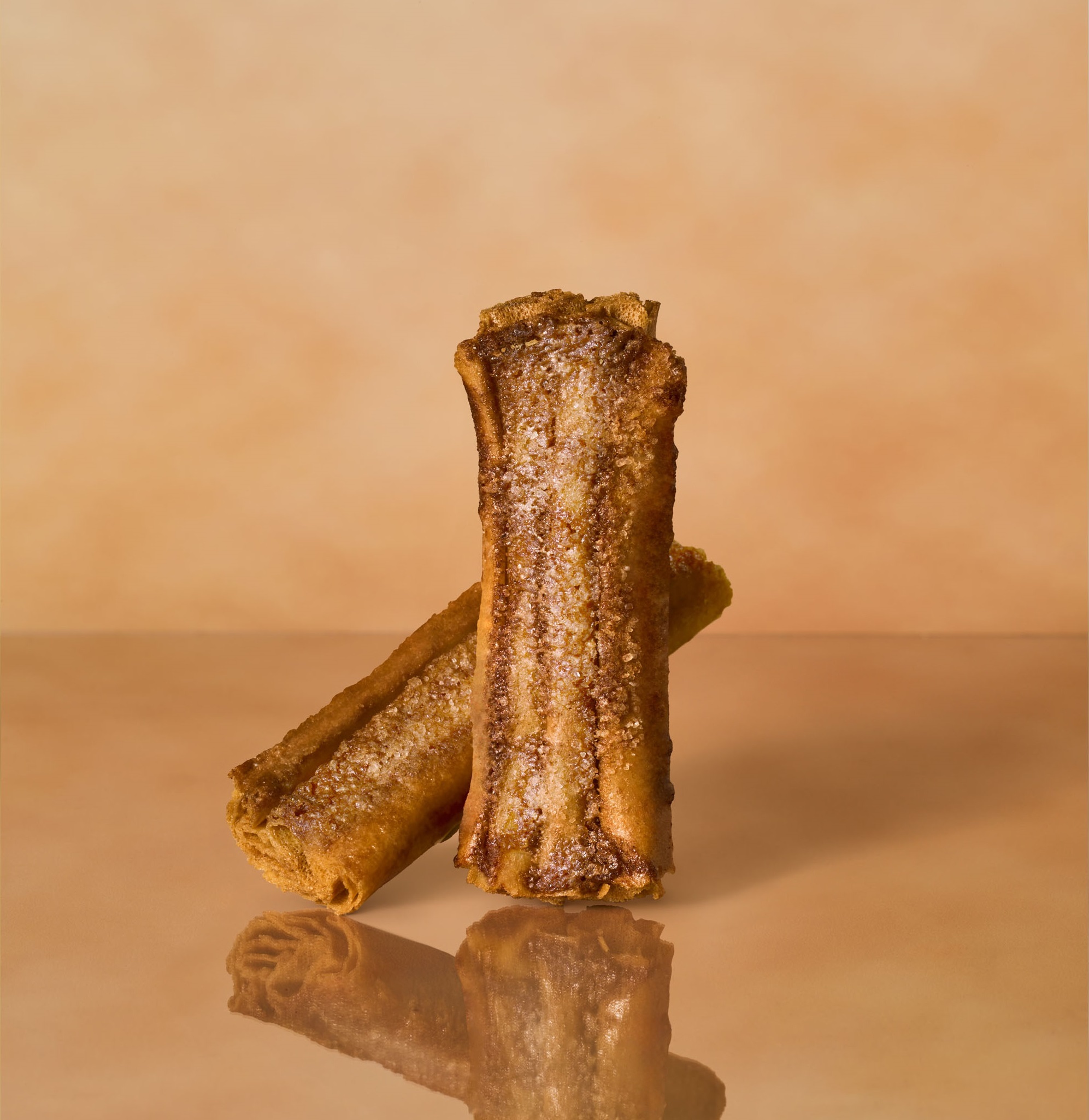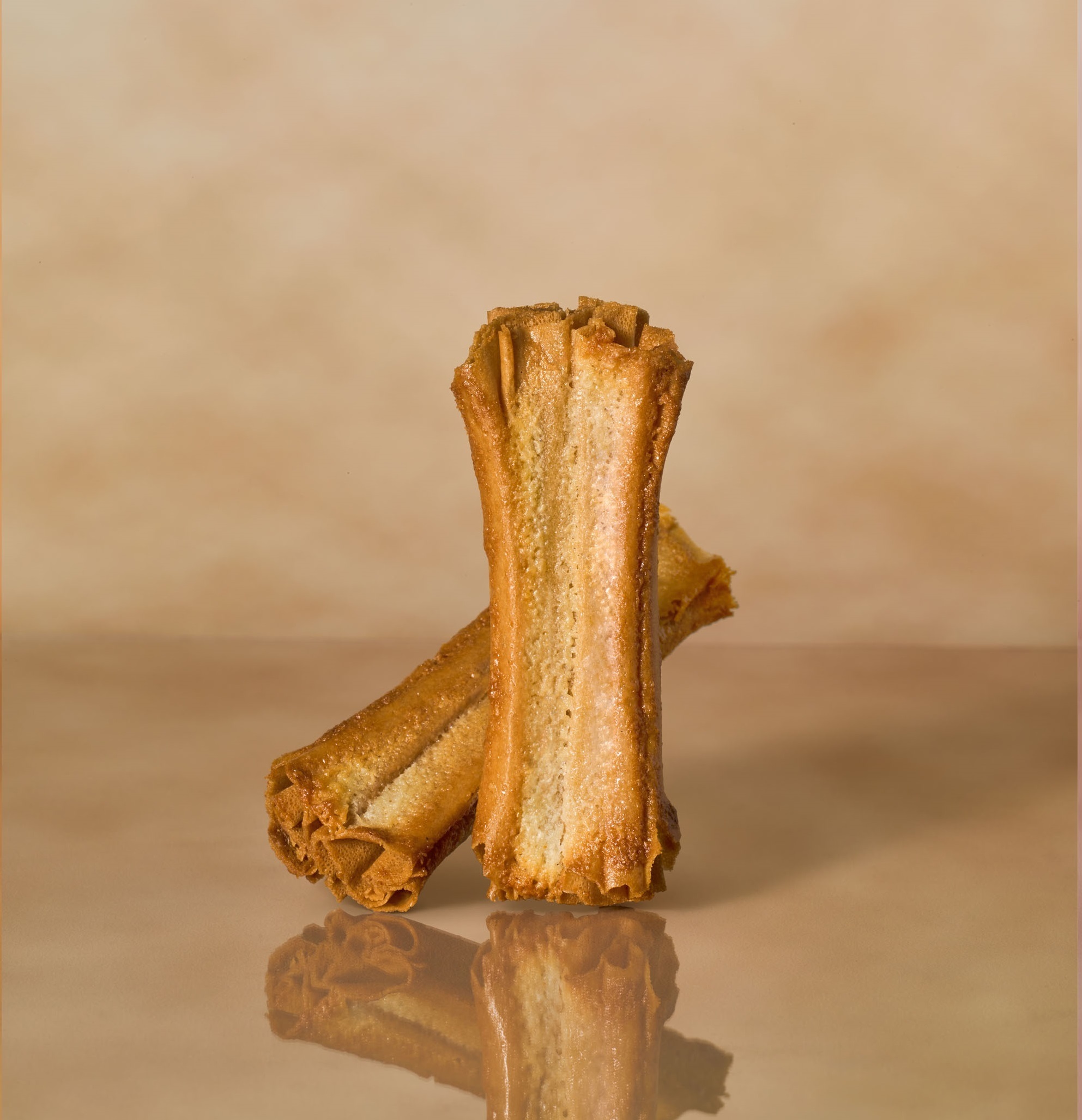 幾重にも重ねて焼きあげたクレープ生地を、生クリームやバターでおいしさを高めた直火焚きキャラメルと香ばしいアーモンドで飾りました。フロランタン風に仕上げた特別なルマンドです。