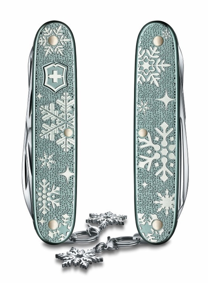 「パイオニアX ウィンターマジック」は華やかで魅力的なだけでなく、繊細な雪の結晶のモチーフを特徴とした革新的なアルミニウムハンドルがとてもユニークです。ビクトリノックスのALOXマルチツールでよく知られているアルミニウムハンドルのギョーシェ加工(凹凸模様)の代わりに、光の加減や見る角度によって微妙に変化するブルーグレーのハンドルに仕上げ、その上に舞い散る大小さまざまな雪の結晶をデザインしています。このチャーミングなマルチツールをさらに魅力的にする、雪の結晶をモチーフにしたチャームは、マルチツールのキーリングにだけでなく、ファッションアクセサリーとしてブレスレットやネックレスなど、その他にも色々なものに取り付けることができます。