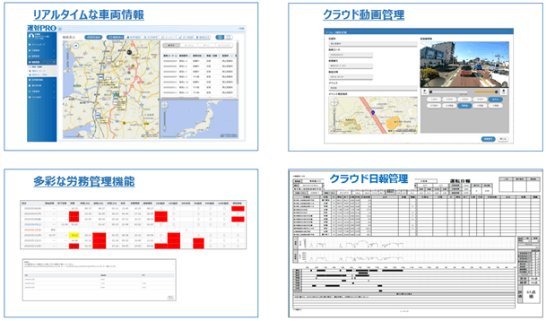 拘束時間、改善基準告示違反のチェック、運行計画書の作成、GPS を利用した動態管理、アルコール検知器との接続、運転日報の作成、稼働実績等の集計、ドライブレコーダーによるヒヤリハット蓄積等、運行管理と安全運転指導に必要な標準的な機能がすべて揃っています。